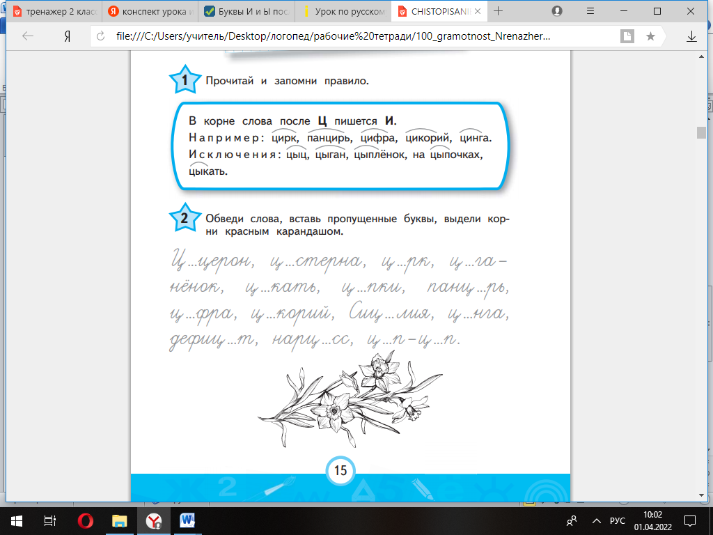 – Чтобы узнать, когда после Ц пишется Ы, а когда – И, обратимся к рабочей тетради. Прочитаем правило и выполним задание. Обводим слова, вставляем пропущенные буквы, пишем красиво и аккуратно. Будьте внимательны!