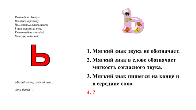 Педагогическая цель | Повторить ранее изученные сведения о мягком знаке, познакомить учащихся с переносом слов с мягким знаком. |