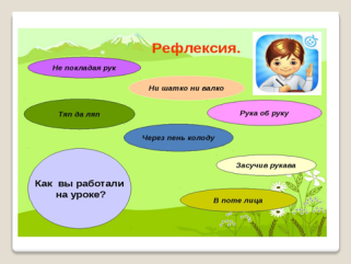 1). Пропишем букву ь. -Посмотрите и скажите , где находится буква ь в алфавите. 2). Показ образца. Письмо буквы учащимися. В нашем классном словаре найдите слова, в которых букв больше, чем звуков: работа, посуда, январь, сорока, лисица, вдруг, трамвай, декабрь, фамилия, коньки, ученик, пальто, весело, февраль. -На какие две группы их можно разделить? Запишите эти три слова из словаря в тетрадь по памяти по порядку. -Чтобы узнать новое слово, найдите его в строке букв, читайте через букву. - Измените слово так, чтобы буква ь оказалась в середине слова. - Составьте предложение с этим словом. - Запишем предложение: У доски стоит учительница. Слово учительница нужно перенести. Все его по - разному перенесли. Надо выбрать правильный вариант : у- чительница учи-тельница учитель-ница учител-ьница -Где мы можем узнать, как правильно переносятся слова с ь в середине? - Откройте учебник на стр. 92., прочитайте правило переноса. - Откройте домашнее упражнение 155. Прочитайте загадку и отгадку. Слово холодильник разделите для переноса. __________________________________ 1).Проведём игру «Наоборот». Я говорю слово, а вы говорите противоположное по значению – антоним: Маленький -? Здоровый -? Сладкий -? Вред - ? -Что общего во всех словах? Как эти слова можно перенести? ___________________________________ 2). Игра «Один – много» На доске слова: День-? Зверёк -? Палец- ? Жилец - ? -Что общего во всех словах? Какие слова перенесли? Игра «Делай ТАК, делай ТАК, делай ТАК, а ТАК не делай!» ____________________________________ 1). ПИСЬМЕЦО МАЛЬЧИКИ КАПЕЛЬКА 2) Составление правила. 3). Выбери правильный перенос : пен-ьки, конь-ки, лос-ь 4). Предложения. ________________________________ Учебник стр. 91 № 158 Вставить нужные буквы, запомнить слова из словаря. - Какая тема урока была? - Какую цель ставили? Достигли цели? -Чему вы научились на уроке? Оцените свою деятельность на уроке, используя разные цвета. Как вы трудились на уроке, используйте для ответа подходящий фразеологизм. | - Выполняют задания в группе, наблюдают , делают вывод: 1гр. Мы писали слова с ь на конце слова, чтобы показать мягкость согласного звука. 2гр. Мы писали слова с ь в середине слова, чтобы показать мягкость согласного звука. 3гр. В словах букв больше, чем звуков, так как в них ь, а он не обозначает никакого звука -Сегодня мы будем писать слова с ь в конце и в середине слова. - Мы будем учиться переносить слова с ь.
