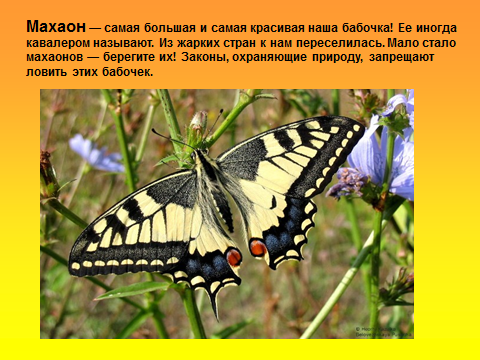-Вот другая бабочка. Эта бабочка называется махаон. Живет во многих местах в Евразии, Африке, Японии. Очень красивая бабочка с изящной формой крыльев. Посчитайте сколько различных цветов присутствует в ее окраске? Из чего состоит узор на крыльях? (Из кругов, волнистых линий, пятен). Учитель рассказывает о других дневных бабочках.