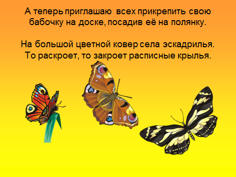 -А теперь приглашаю всех прикрепить свою бабочку на доске, посадив её на полянку.