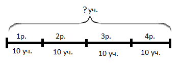 | Метод: Работа в учебнике. Решение задач. - Прочитайте задачу 6 (На спортивных занятиях учащихся построили в 4 ряда, по 10учеников в каждом ряду. Сколько всего учеников было в этих рядах?). - Сколько рядов? - Сколько учеников в ряду? - В каждом ряду количество учеников одинаковое? - Отступаем две клетки и пишем: «Задача». -Чертим отрезок: - Отрезки будут одинаковыми?