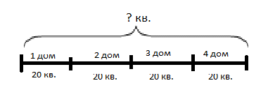 - Запишите решение задачи и ответ. - Прочитайте задачу 7. (В поселке построили 4 дома. В каждом доме по 20 квартир. Сколько всего квартир в этих домах?) - Сколько домов и квартир? - Чертим отрезок: - Отрезки будут одинаковыми?