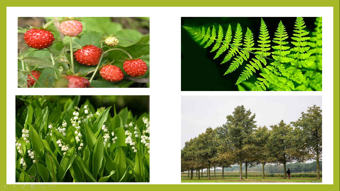 Коммуникативные УУД: Познавательные УУД: - умение осознанно строить речевые высказывания. | Как называется наука, которая изучает живую природу? На какие царства ученые-биологи делят живую природу? Посмотрите на слайд, что объединяет эти картинки? Чем отличаются картинки? | Биология Бактерии, грибы, растения, животные, вирусы На картинках изображены растения. На одной картинке дерево, на другой травы, на третьей цветы, а на четвертой кустарник. | 3 мин |