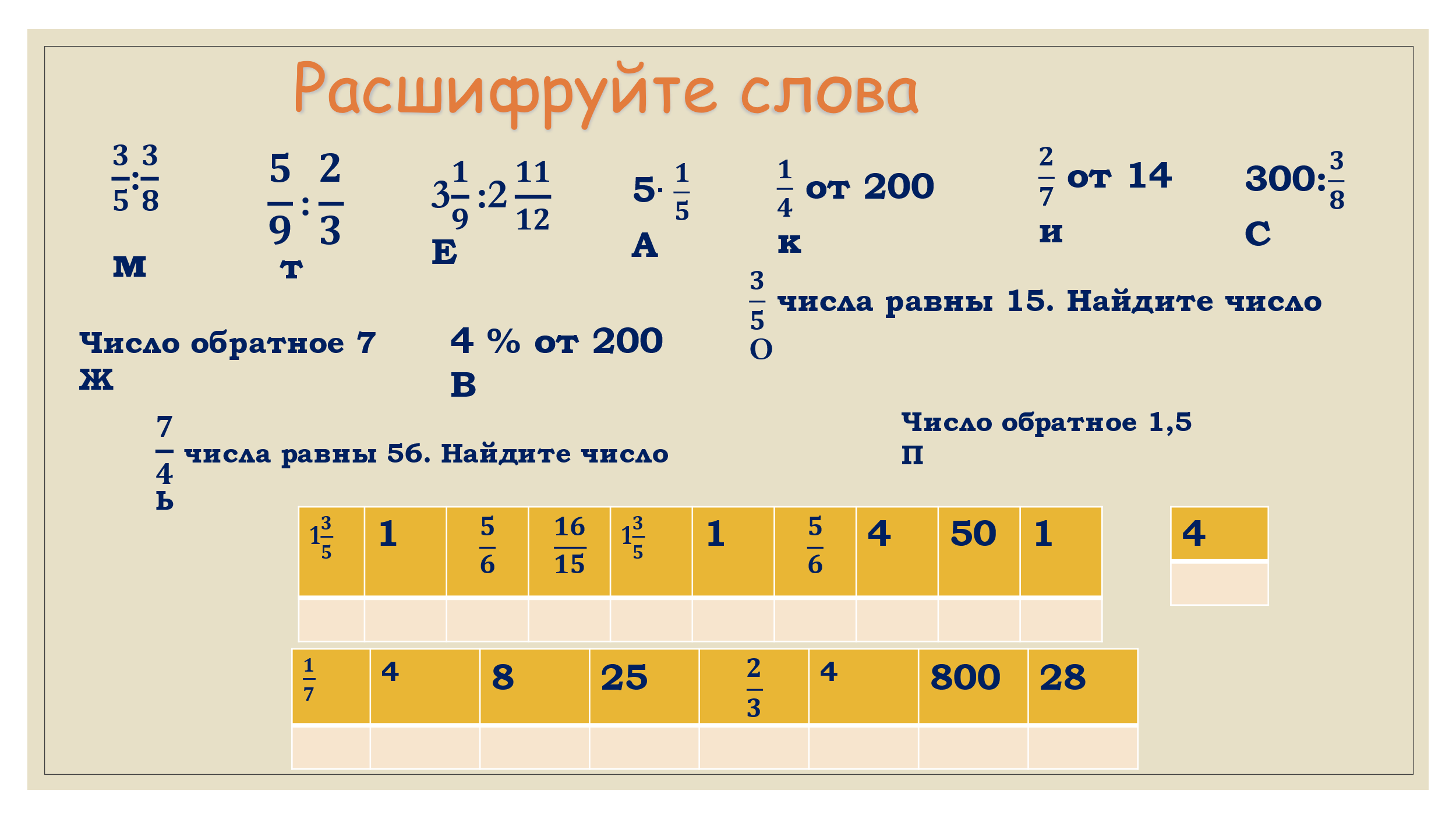 Цели | Образовательные: способствовать формированию умения решать задачи на нахождение числа по его части, выраженной дробью, способом деления на дробь; Формировать УУД: формировать умение выявить тип задачи и способ решения Личностные УУД (ЛУУД):Объясняют самому себе свои отдельные ближайшие цели саморазвития, проявляют положительное отношение к урокам математики, дают самооценку результатов своей учебной деятельности. Регулятивные УУД (РУУД): определяют цель учебной деятельности, осуществляют поиск средств её достижения. Познавательные УУД (ПУУД): Закрепить знания учащихся по теме деление обыкновенных дробей. Показать связь математики и изобразительного искусства |