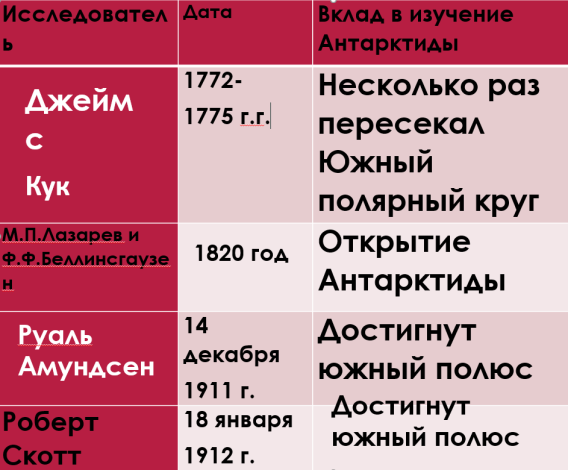 Цель | создание условий для формирования представления об истории открытия и исследований Антарктиды, формировать умения анализировать различные источники географической информации. |