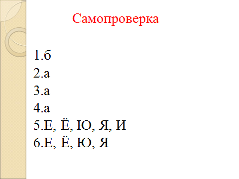 Тест «Разделительные Ъ и Ь знаки» 1.Где пишется разделительный мягкий знак в словах? Обведи вариант ответа. а) сразу после приставок; б) в корне и после корня слова. 2.Где пишется разделительный твёрдый знак в словах? а) сразу после приставок; б) в корне и после корня слова. 3.С каких букв должен начинаться корень, чтобы писать разделительный ъ знак? а) с гласных; б) с согласных. 4. На какую букву должна оканчиваться приставка перед разделительным твёрдым знаком? а) на согласную; б) на гласную. 5. Перед какими гласными пишется разделительный мягкий знак? Обведи нужные буквы. А, Е, Ы, Ё, Ю, Я, О, Э, У, И 6. Перед какими гласными пишется разделительный твёрдый знак? Обведи нужные буквы. А, Е, Ы, Ё, Ю, Я, О, Э, У, И 4. Самопроверка (сравнить с ответами, записанными на доске) Поставьте + напротив правильного ответа.