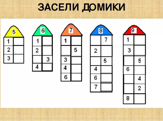 Перед вами изображены домики для 5, 6,7,8,9. Запишите результат в карточки. И сравните ваш результат с записью на доске | ||||||||||||||||||||||||||||||||||||||||||||||||||