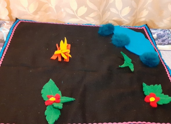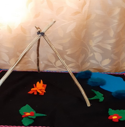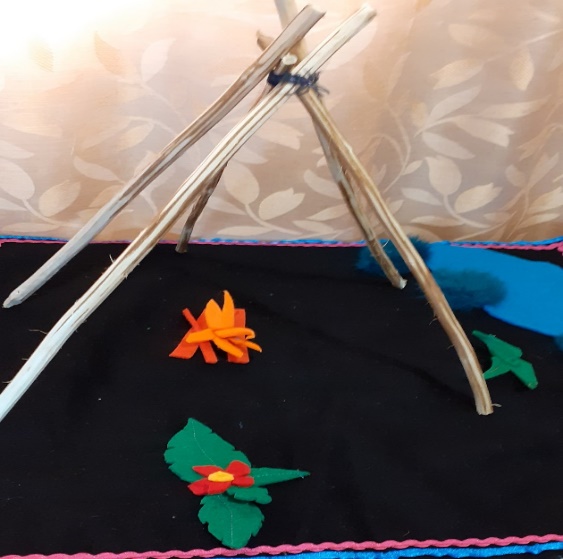 Когда чум готов, мужчины (папа)уходит в лес рубит дрова топором и приносит с леса дрова. Разжигает костер в чуме. Женщины (мама) прибираются в чуме, расстилают постель.