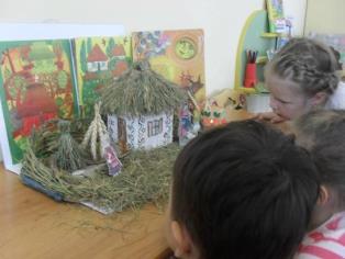 С ребятами исследуем свойства этих материалов и пробуем соорудить такую же мазанку. Оказалось, что это трудное дело. Совместными усилиями построили. Да еще украсили мазанку узорами.
