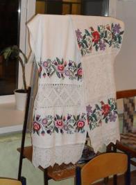 Старинные вышитые рушники и посуда для рассматривания с детьми.