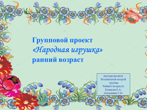 05.02.2023 Групповой проект "Народная игрушка" Принять участие в этом конкурсе Описание конкурса Список всех конкурсов Ахмадиева Гульнара Мидхатовна МБДОУ "Волошка" Конкурсная работа Свидетельство участника экспертного совета жюри Свидетельство можно заказать сразу, как Вы оставите не менее 3 объективных комментариев в этом разделе сайта. Узнать подробнее Консультация для родителей детей 2 - 3 лет "Роль сказки в жизни ребёнка" Из опыта работы педагога дополнительного образования по обучению игре на русских народных музыкальных инструментах. У вас недостаточно прав для добавления комментариев.Чтобы оставлять комментарии, вам необходимо авторизоваться на сайте. Если у вас еще нет учетной записи на нашем сайте, предлагаем зарегистрироваться. Это займет не более 5 минут.