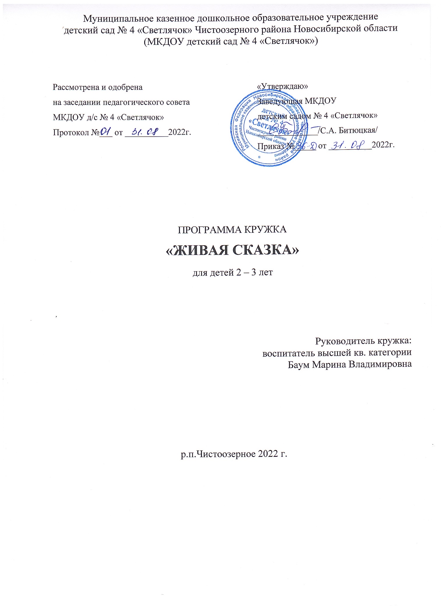 Программа театрального кружка «Живая сказка» Муниципального казенного дошкольного образовательного учреждения детского сада №4 «Светлячок» разработана на основе образовательной программы «От рождения до школы» под ред. Н.Е. Вераксы, Т.Е.Комаровой. М.А.Васильевой, а также на основе методического пособия Маханѐвой М.Д. «Театрализованные занятия в детском саду: Пособие для работников дошкольных учреждений»