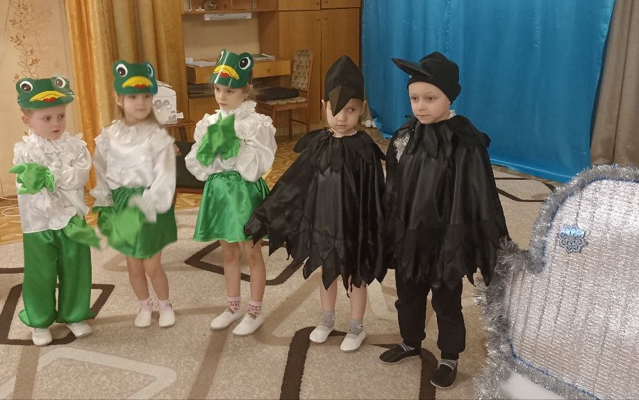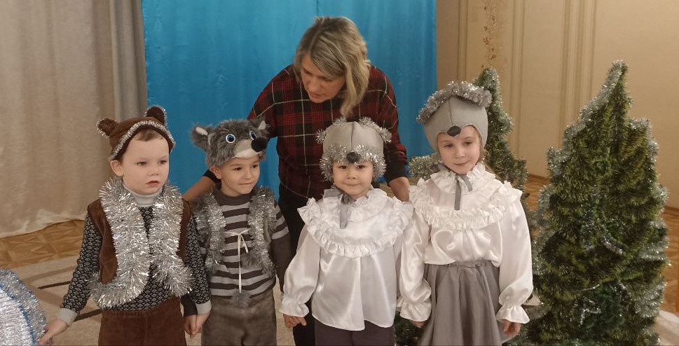 Оборудование: ноутбук, сказочный сундук, снежинка, аудиозапись «В гостях у сказки», музыка для выхода героев, реквизиты для драматизации: маски животных, декорации: лес, озеро, теремок, варежка.