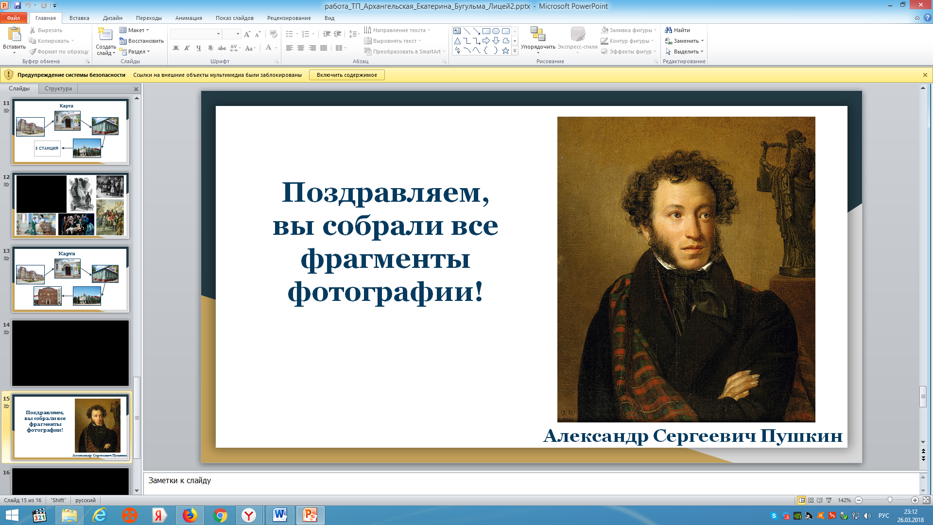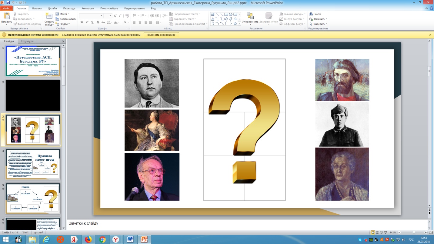Действительно, Пушкин много путешествовал. Так последуем его примеру и отправимся по культурно – образовательному маршруту, связующим звеном в котором будет сам Александр Сергеевич. Но чтобы путешествие надолго запомнилось, его надо провести по – особенному: заставить участников логически мыслить, сравнивать изображения, что – то искать…Но не клад, конечно, а всего лишь в конце пути собрать из фрагментов портрет великого поэта. « О, сколько нам открытий чудных готовит» квест – игра «Путешествие.АСП.Бугульма.РУ». Ну что ж, начнем?