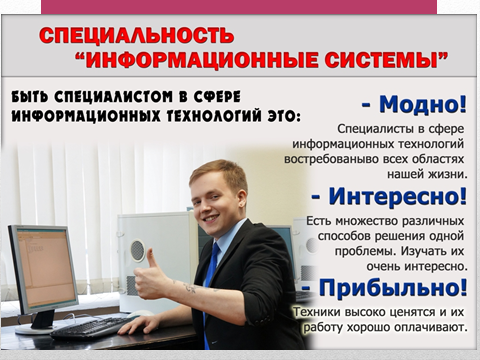 Если Вам известно, что такое сервер, драйвер и килобайт, то у Вас уже есть навыки для овладения данной профессией. Многих парней интересует компьютерное оборудование, в котором большинство людей толком не разбирается. А если Вы разбираетесь и готовы посвятить жизнь компьютерным технологиям, то сомневаться не стоит. Вас ждёт интересная и увлекательная работа по разработке и программированию информационных систем, решению технических задач, модификации отдельных модулей системы и т.д. Также никто не запрещает проектирование и создание собственных систем.