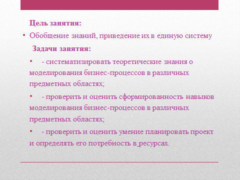 - систематизировать теоретические знания о моделирования бизнес-процессов в различных предметных областях;