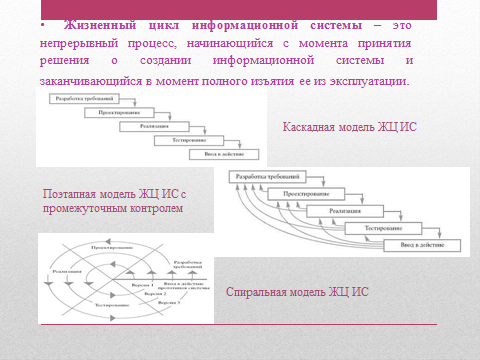 Жизненный цикл информационной системы – это непрерывный процесс, начинающийся с момента принятия решения о создании информационной системы и заканчивающийся в момент полного изъятия ее из эксплуатации.