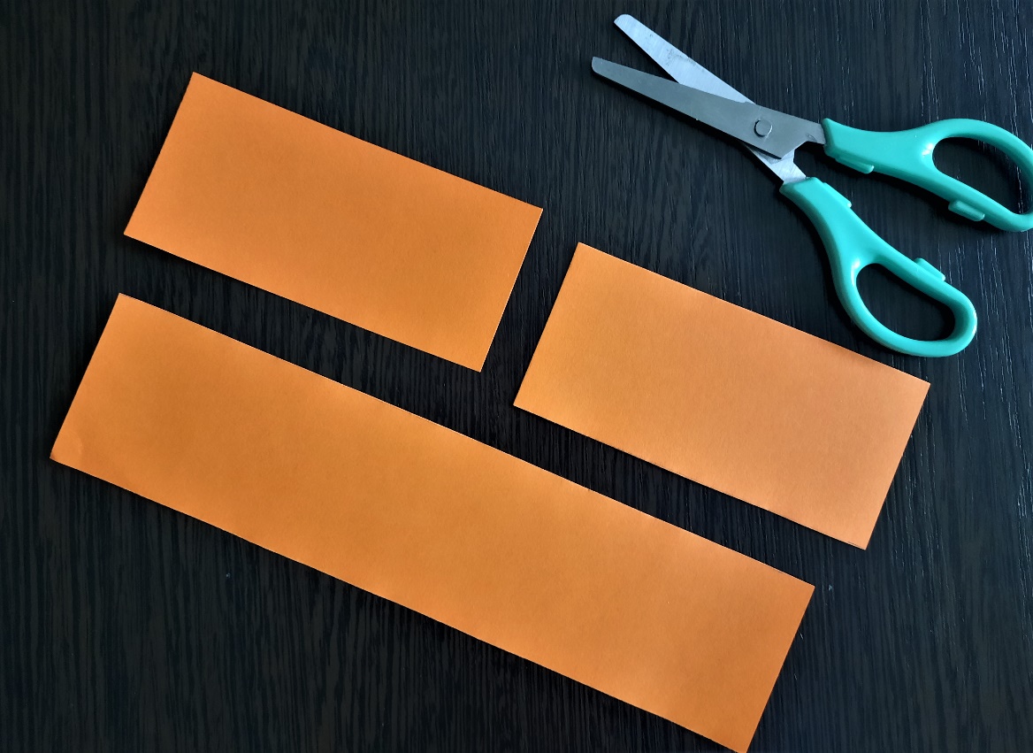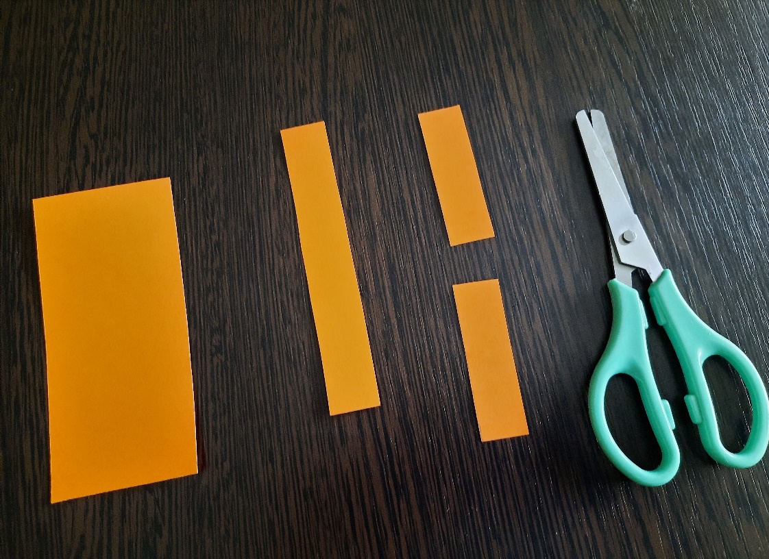 С помощью линейки отмеряем от короткого края формата А-4 оранжевого листа две полоски шириной 5 см. Отрезаем их. Одну полоску оставьте целой, другую разрежьте пополам.