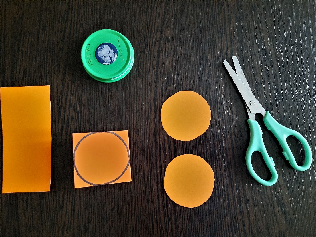 Для головы вам понадобится 2 одинаковых круга. Можно использовать циркуль, диаметр круга не более 5 см. Можно использовать подручные круглые формы заданного диаметра, в данном случае это крышка от детского пюре. Вторую короткую полоску складываем пополам, обводим крышечку или чертим круг циркулем. Вырезаем.