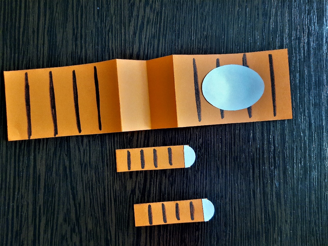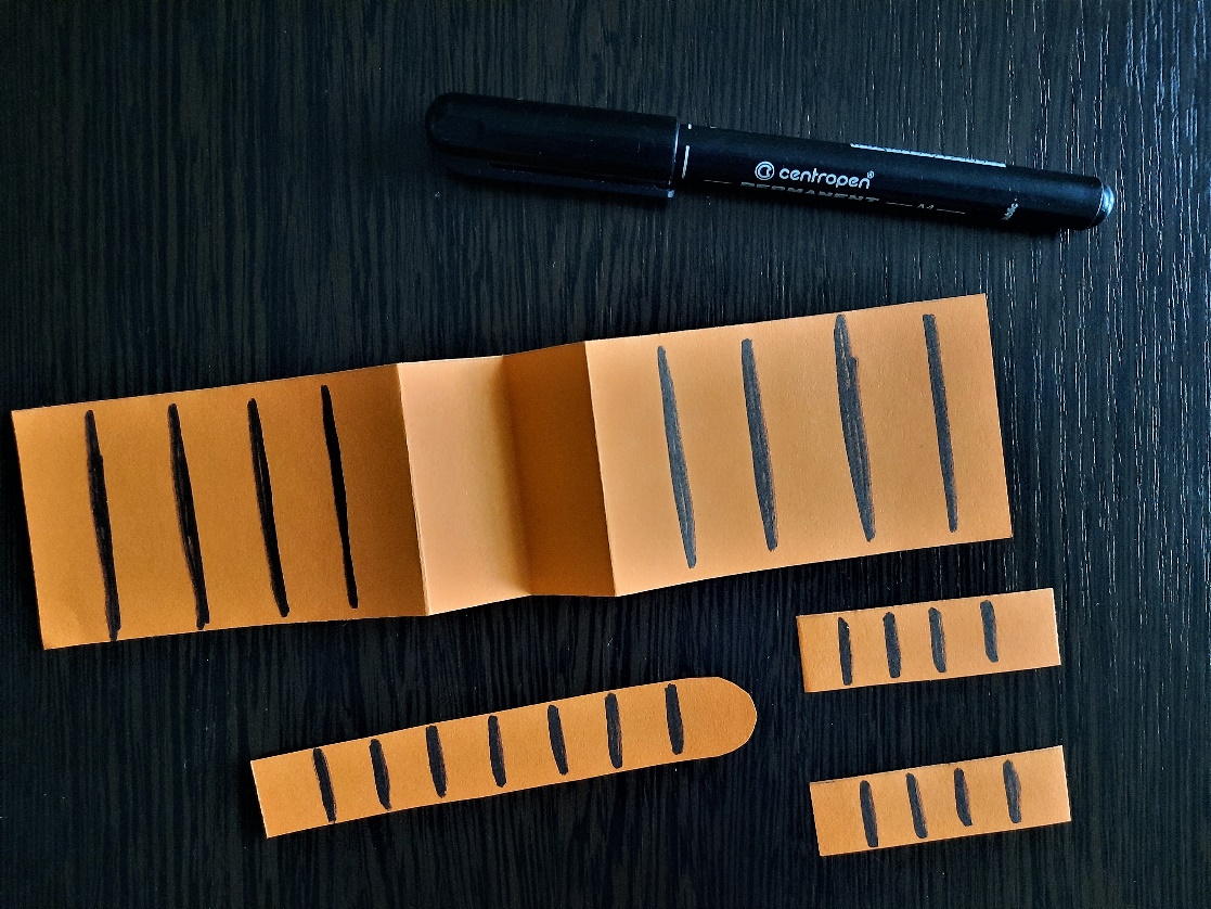 На длинной полоске, сложенной «гармошкой», и на 3-х узких небольших полосочках рисуем чёрным маркером (фломастером, мелком, цветным карандашом, красками) чёрточки. У одной из полосочек, которая будет хвостом, ножницами закругляем один край.
