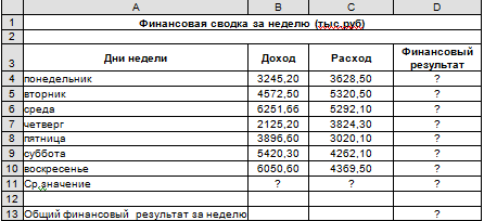 Задание1. Создайте таблицу финансовой сводки за неделю