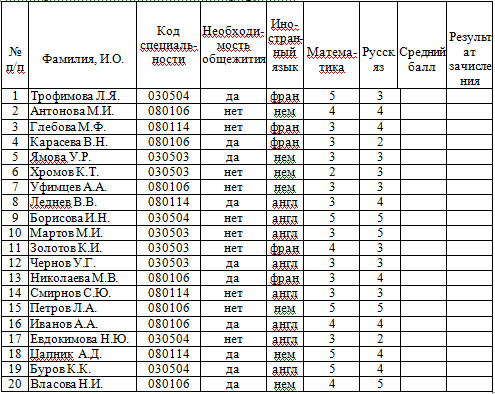 Скопируйте и поместите на лист 4 . Полученную на четвертом листе таблицу озаглавьте «Список зачисленных». (Выделить первую строку- Вставка/Строка)