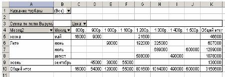 2.Выполнить группировку данных в сводной таблице. Для этого выделить строки июнь,июльавгуст, которая войдет в группу 1. В главном меню выбрать пункт[Данные–Группаиструктура – Группировать]. Появится группа 1, переименовать ее влето. Переименовать в столбце Месяц 2 май – весна, а сентябрь – осень.