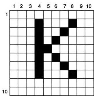 Пример 4. Рассмотрим «маленький монитор» с растровой сеткой размером 10 х 10 и черно-белым изображением. На рис. 1 приведено изображение буквы «К». Представить содержимое видеопамяти в виде битовой матрицы, в которой строки и столбцы соответствуют строкам и столбцам растровой сетки.