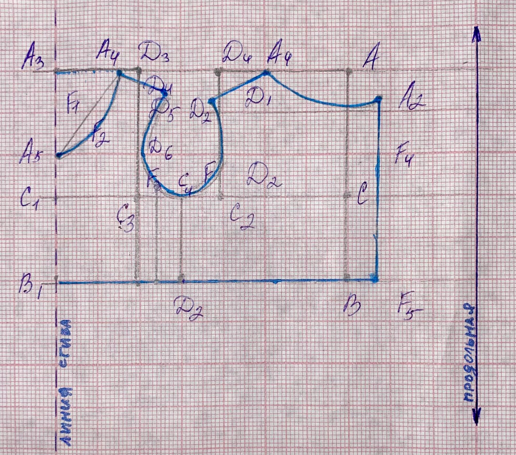 Чтобы оформить пройму передней части изделия, нужно плавной вогнутой линией соединить точки D5, D6, F3 и C4.