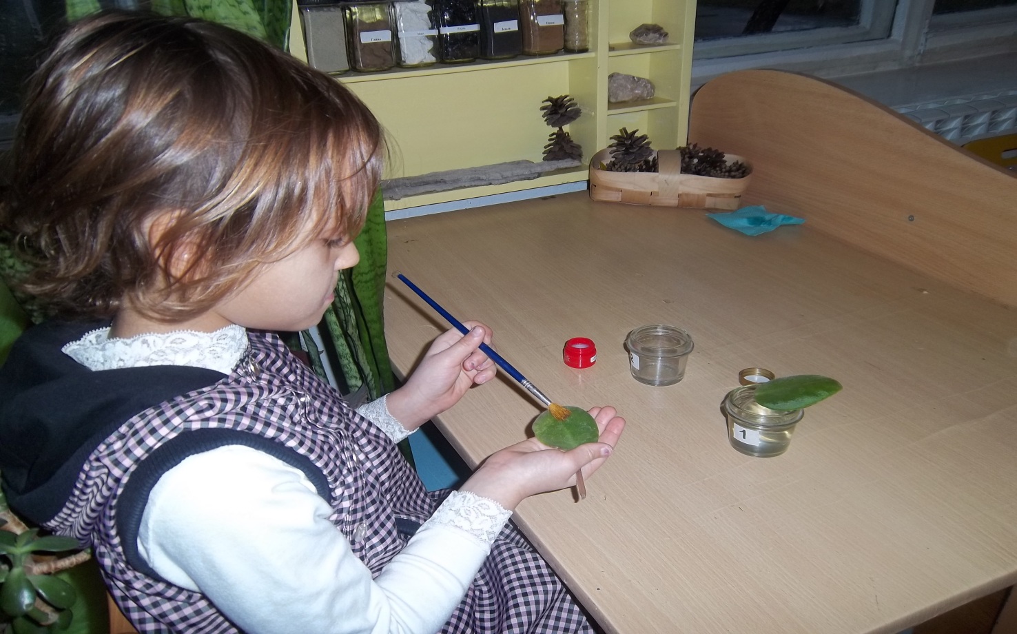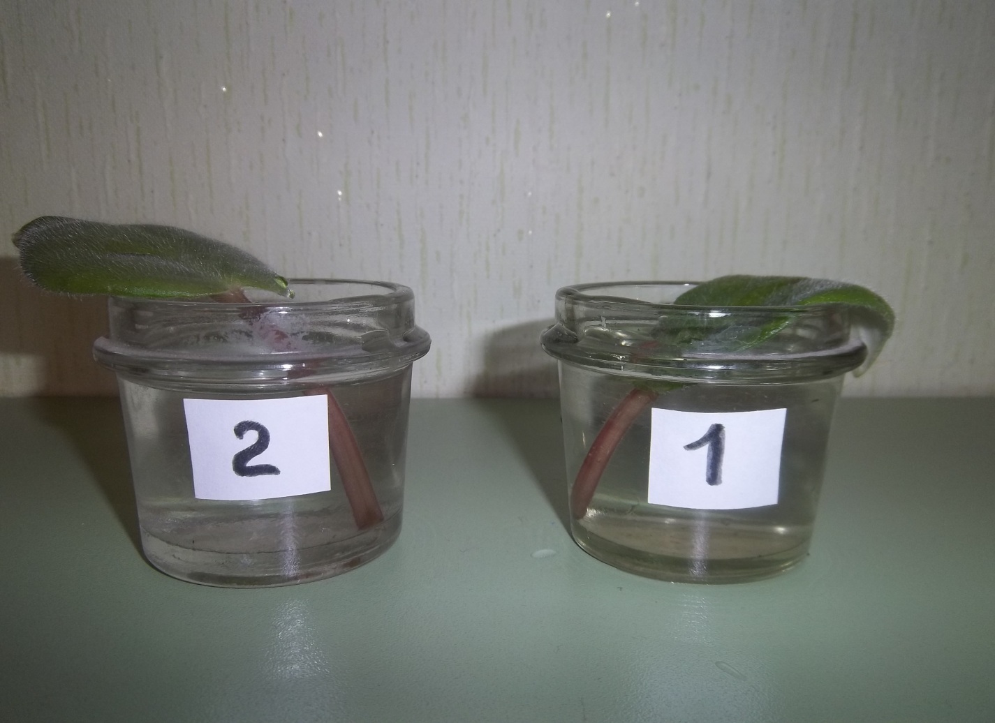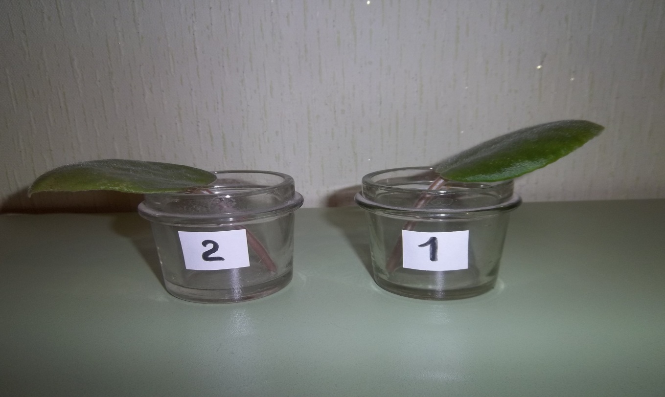 Поставив два листа фиалки Узамбарской в ёмкости с водой (причём лист под номером 1 смазан вазелином) оставили их на несколько дней.