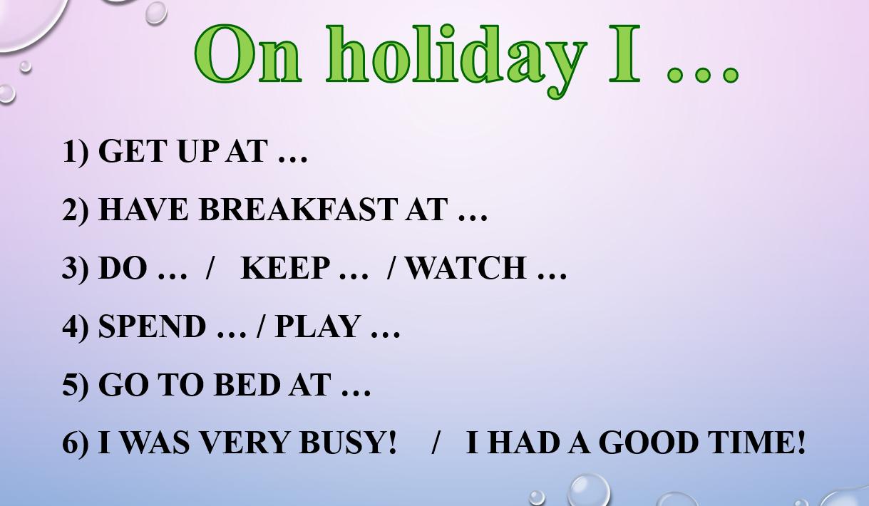We revised past form of some verbs. So, I believe you are ready to tell me about your day on holiday.