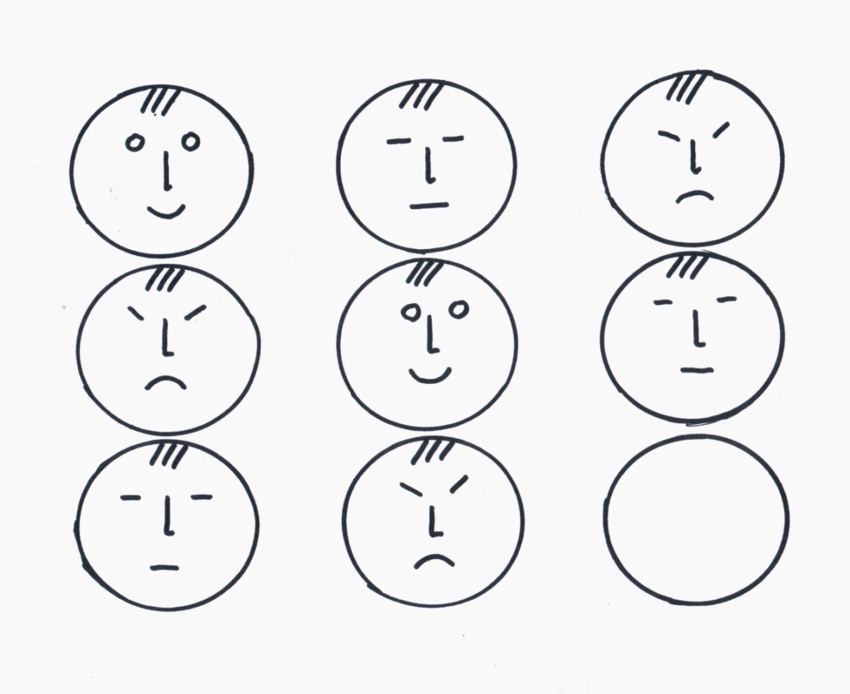 На карточке, предложенной Вам необходимо дорисовать рожицу, которой не хватает в третьем ряду, и отнести жюри.