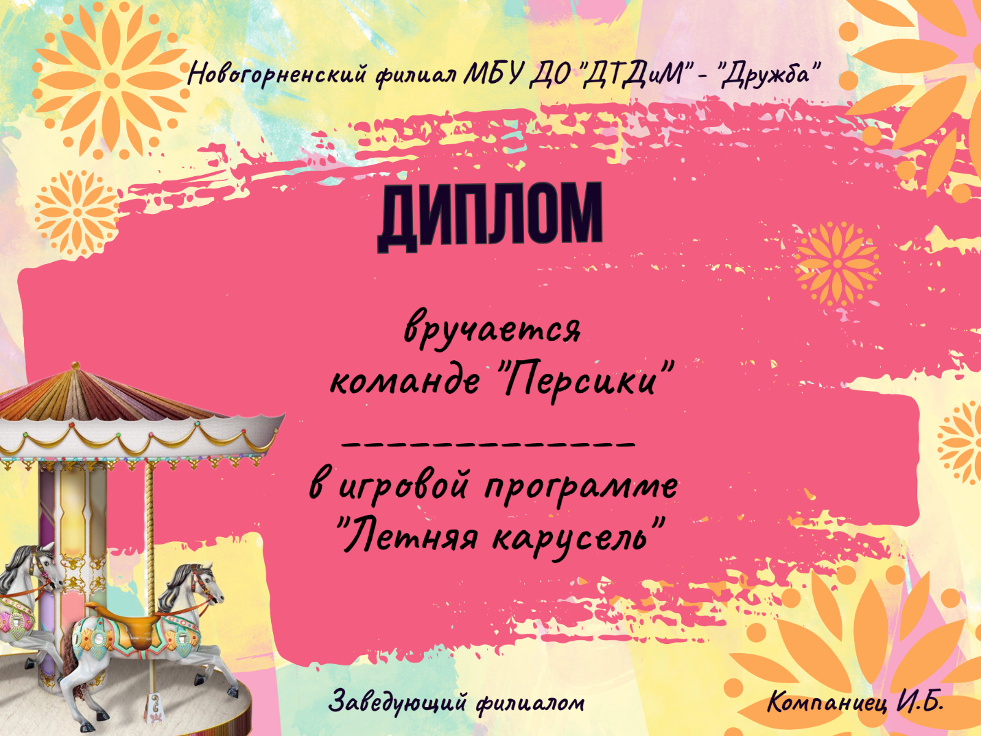 Ведущий: Мы как раз хотели прокатится на летней карусели! И в круговороте игр определить самую сплоченную команду. Самых успешных и старательных ждет приз!