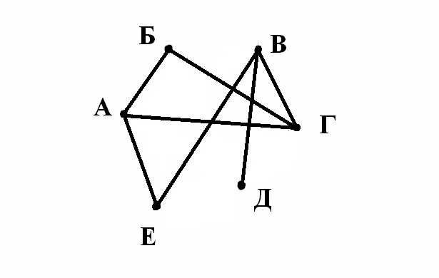 Точки А, Б, В, Г, Д, Е называются вершинами графа, соединяющие их отрезки – ребрами графа.