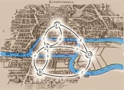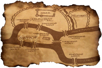 Бывший Кёнигсберг расположен на реке Прегель. В пределах города река омывает два острова. С берегов на острова были перекинуты мосты. Старые мосты не сохранились, но осталась карта города, где они изображены. Жители города предлагали приезжим следующую задачу: пройти по всем мостам и вернуться в начальный пункт, причем на каждом мосту следовало побывать только один раз. До Эйлера никто не мог этого сделать, но и доказать, что это невозможно, тоже ни у кого не получалось. Как поступил Эйлер?