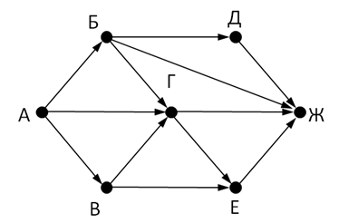 На рисунке - схема дорог, связывающих города А, Б, В, Г, Д, Е, Ж. По каждой дороге можно двигаться только в одном направлении, указанном стрелкой. Сколько существует различных путей из города А в город Ж?