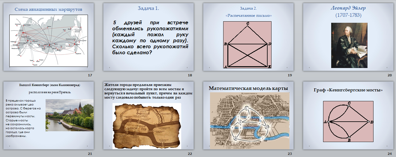 Графы широко используются в современной математике и программировании. С теорией графов связаны не только математические головоломки, но и такие серьезные науки, как теория отношений и теория групп. Графы находят все новые приложения в теории планирования и управления, теории расписаний, социологии, математической лингвистике, биологии и медицине.