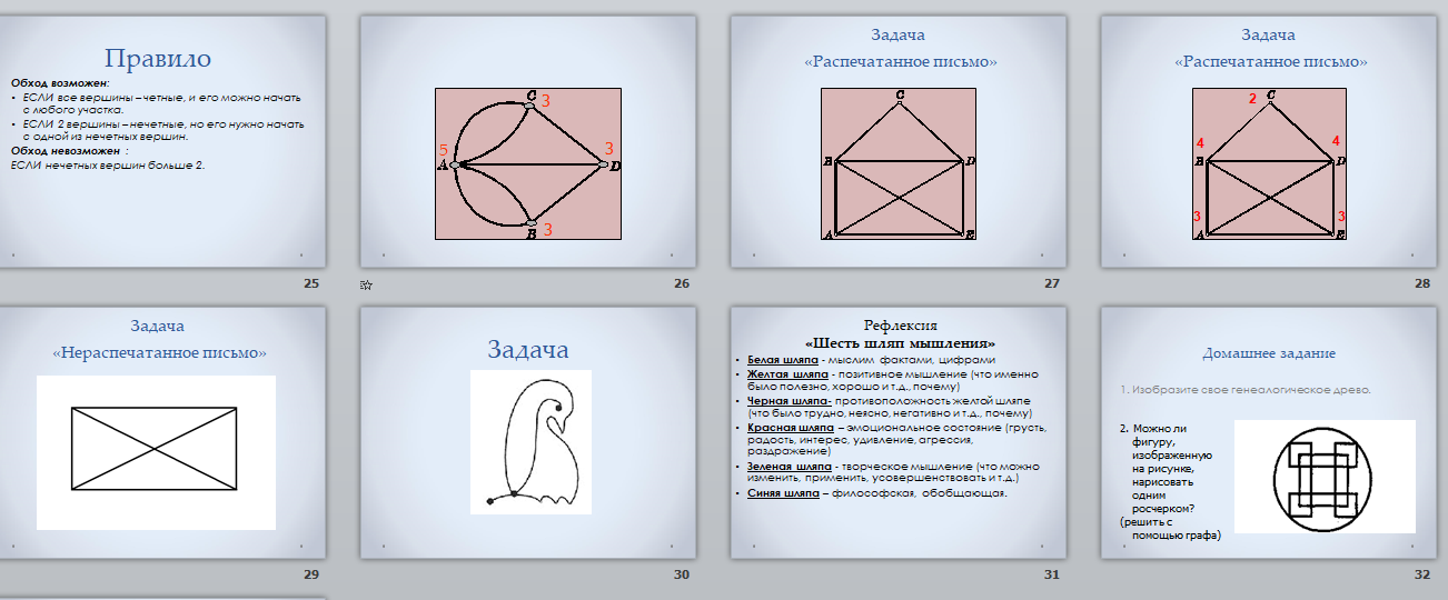 2. Хочу предложить вам решить задачу – загадку. Перед вами граф – "распечатанное письмо". Попробуйте начертить этот граф не отрывая карандаша от бумаги и не проводя по одной линии дважды.