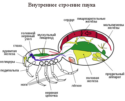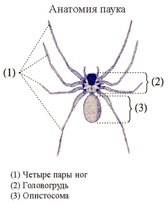 Тело паука состоит из двух частей, соединенных стебельком: головогруди и брюшка (опистосомы).