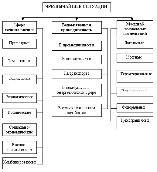 Первый – сфера возникновения, которая определяет характер происхождения ЧС. По этому признаку различают ЧС космического, природного, техногенного, экологического, биолого-социального, социально-экономического, военно-политического и комбинированного происхождения.