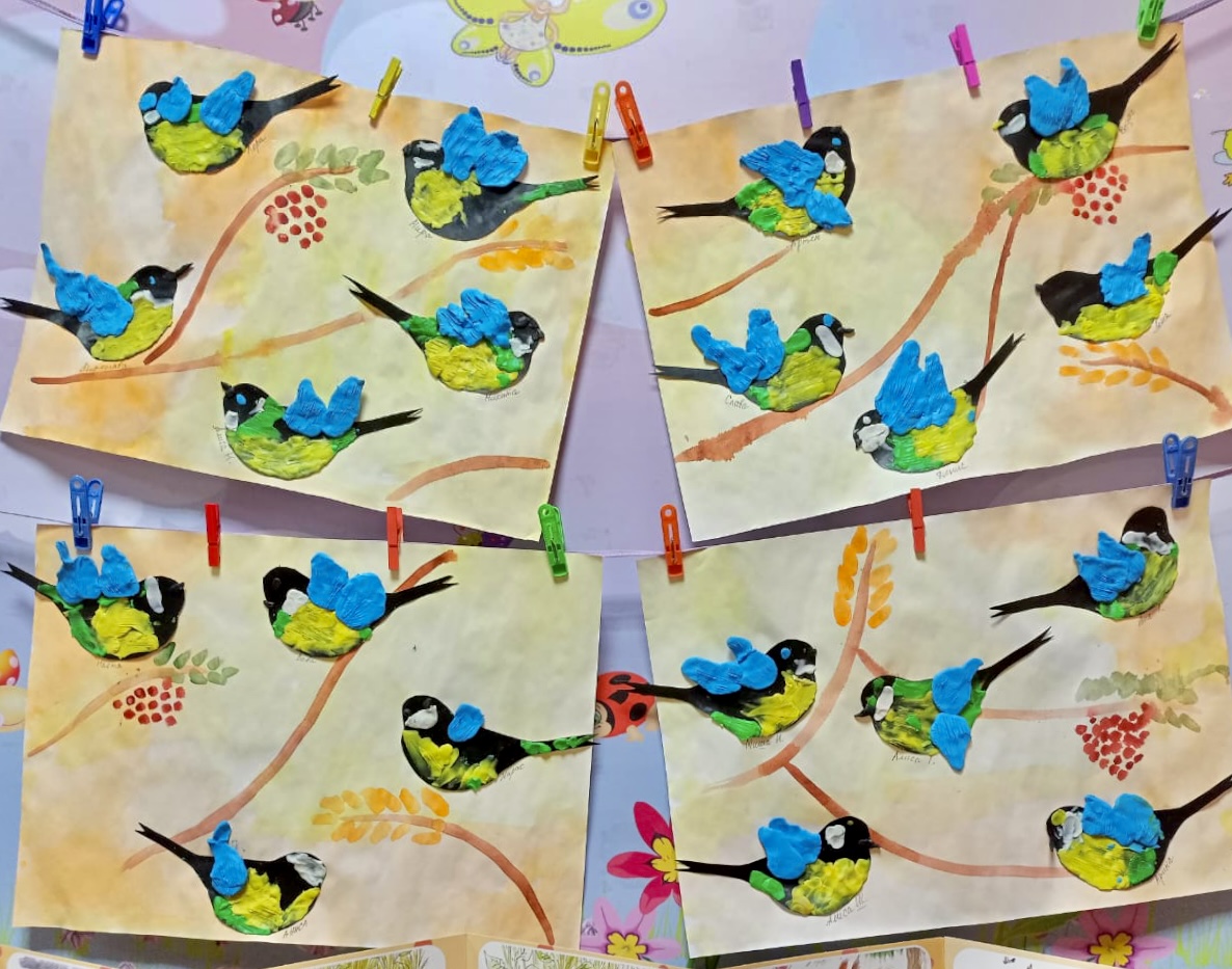 Возьму самый большой кусок - синий пластилин. Я разделю его на две части. Сформирую колбаску и начну формировать капельку. Получается крыло, надо сделать еще одно - точно такое же, ведь у птичек по два крыла. Какие красивые синицы у нас получились,все особенные и неповторимые!