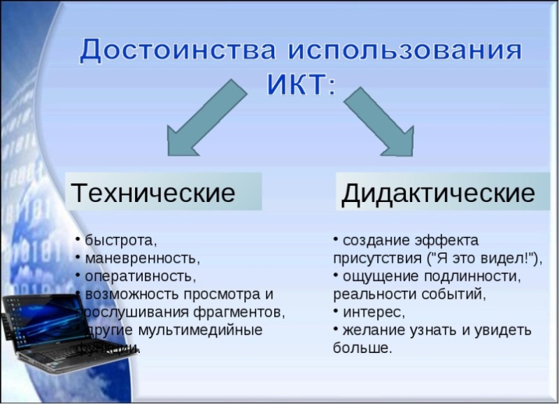 Достоинства использования ИКТ можно свести к двум группам: техническим и дидактическим.