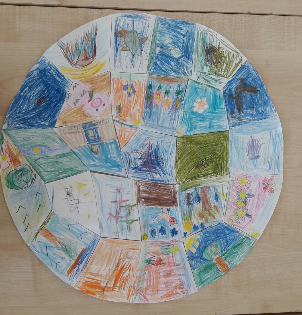 Воспитатель раздает каждому ребенку по одному пронумерованному фрагменту листа ватмана и предлагает нарисовать на нем любое живое существо – животное, растение, птицу, насекомое. Когда все дети закончат рисовать, на белом круге, символизирующем нашу планету, воспитатель собирает из разукрашенных фрагментов Землю. (нумерация позволяет сделать это очень быстро).