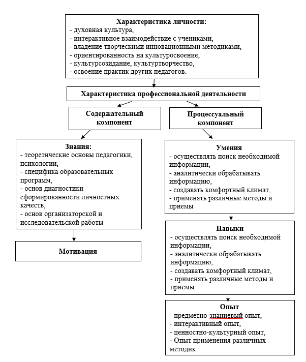 В свою очередь, В.М. Панфилова, А.Н. Панфилов и А.И. Газизова отмечают, что компетентность педагога предполагает наличие у негоактуальных технологических и культурологических знаний, новейших образовательных идей, умения моделировать школьную дидактику. Необходимо еще в студенчестве научить его конструировать и прогнозировать собственную профессиональную деятельность [21].