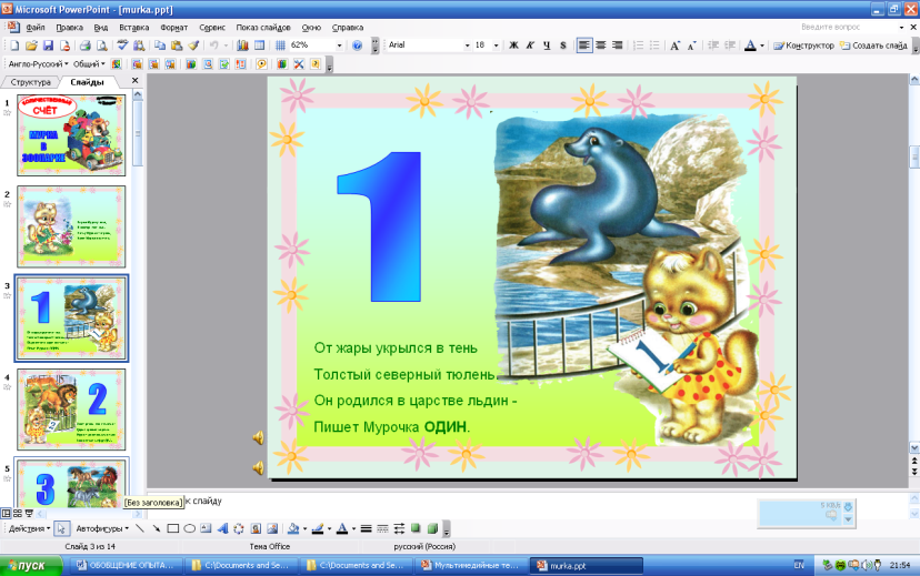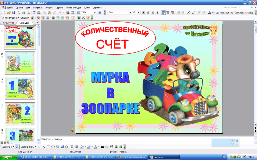 На этапе ознакомления с количественным счётом я использую презентации (MSPowerPoint). Например, презентация Натальи Уставицкой «Мурка в зоопарке», электронный ресурс http://viki.rdf.ru/item/291/.