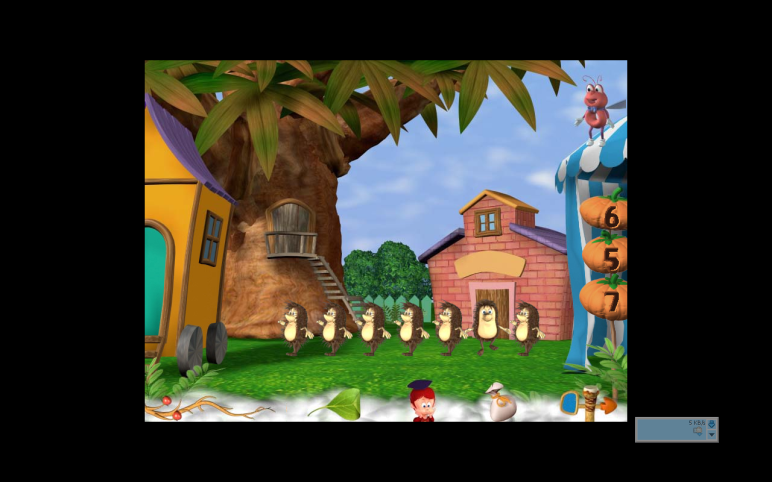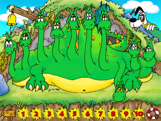 Анимационный сюжет: по звонку колокольчика у смешного 10-голового дракона в разном количестве просыпаются головы, ребёнок должен посчитать: сколько голов проснулось, и показать соответствующую цифру. Далее он слышит звуковое одобрение или предложение посчитать ещё раз. Это задание можно выполнять, считая объекты и находя числа по очереди или группой.