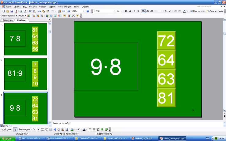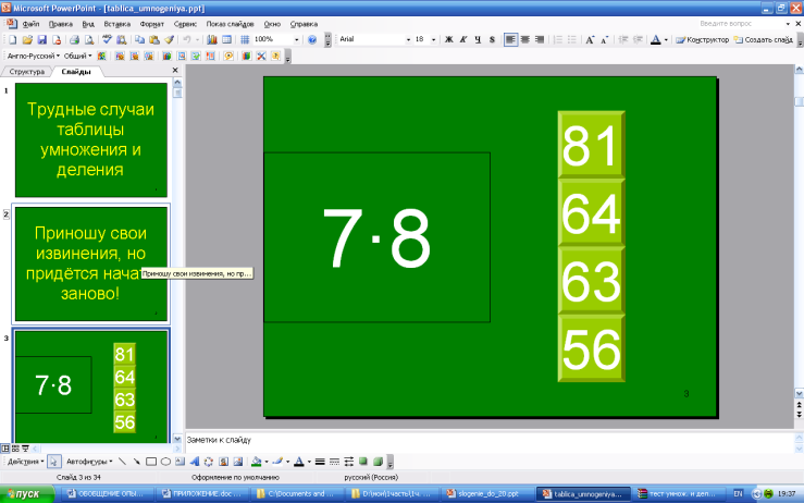 Для проверки знания табличный случаев умножения я использую такие виды заданий как математический диктант (если нужно проверить знание таблицы умножения у всего класса) и тесты в программе MSPowerPoint (если проверить знание таблицы умножения у одного учащегося). Ребятам нравится работать с тестами. (Слайд 9,10)Например, презентация – тест Марченко В.В. «Трудные случаи таблицы умножения и деления», электронный ресурс http://viki.rdf.ru/item/414/
