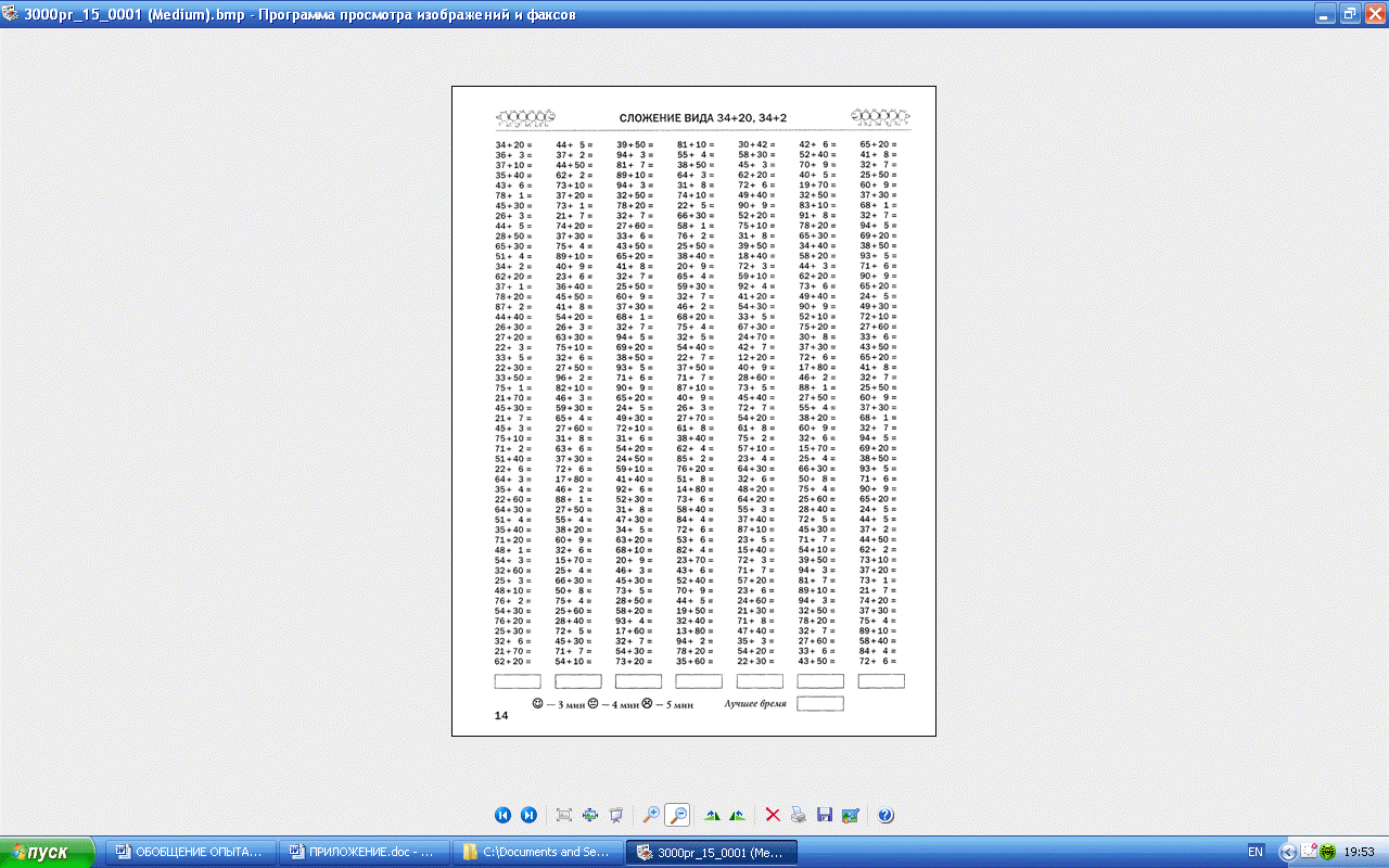 Систематически, в один постоянный день недели на уроке математики я провожу пятиминутные тренировочные или контрольные задания – перфокарты в виде игры «Кто быстрее?!». Всем ребятам я раздаю одинаковые индивидуальные перфокарты. За 5 минут учащийся должен решить наибольшее возможное количество примеров. После я проверяю правильность выполнения, фиксирую у себя результат. Лист с выполненным с заданием я возвращаю ученику. Ученик видит только свой результат. Для создания наибольшей комфортной эмоциональной атмосферы я сообщаю только лучшие результаты.