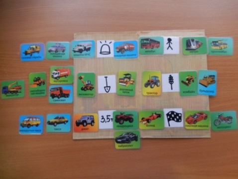 1.«Знаешь ли ты». Ребёнок рассматривает дидактический материал, называет различные виды транспорта, которые изображены на иллюстрациях и раскладывает их в соответствии с цветом поля или значка.